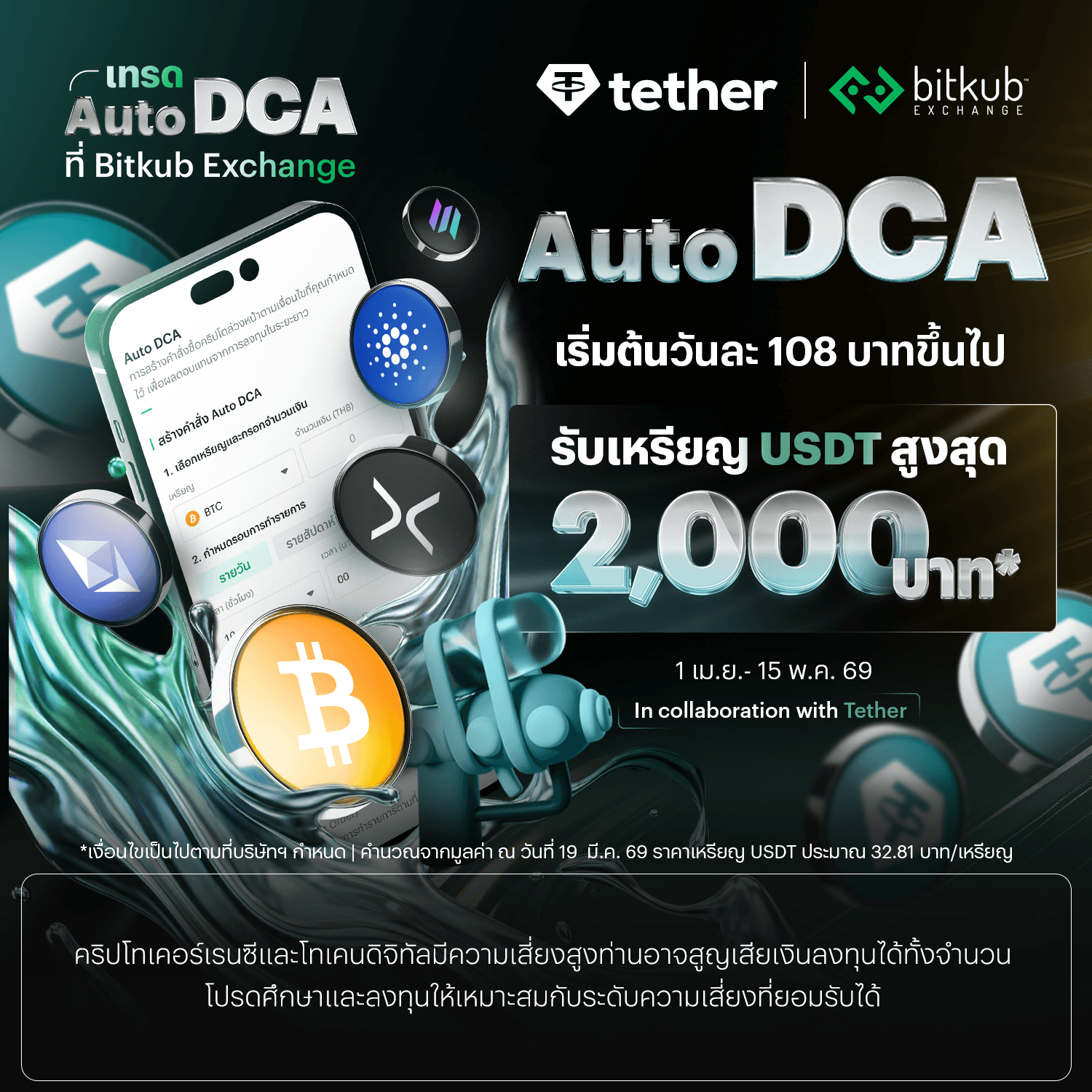 1. กิจกรรมAuto DCA เริ่มต้นวันละ 108 บาท ครบ 30 วัน รับ USDT มูลค่าสูงสุด 2,000 บาท (“กิจกรรม”) นี้จัดขึ้นโดยบริษัท บิทคับ ออนไลน์ จำกัด (“บริษัทฯ”)