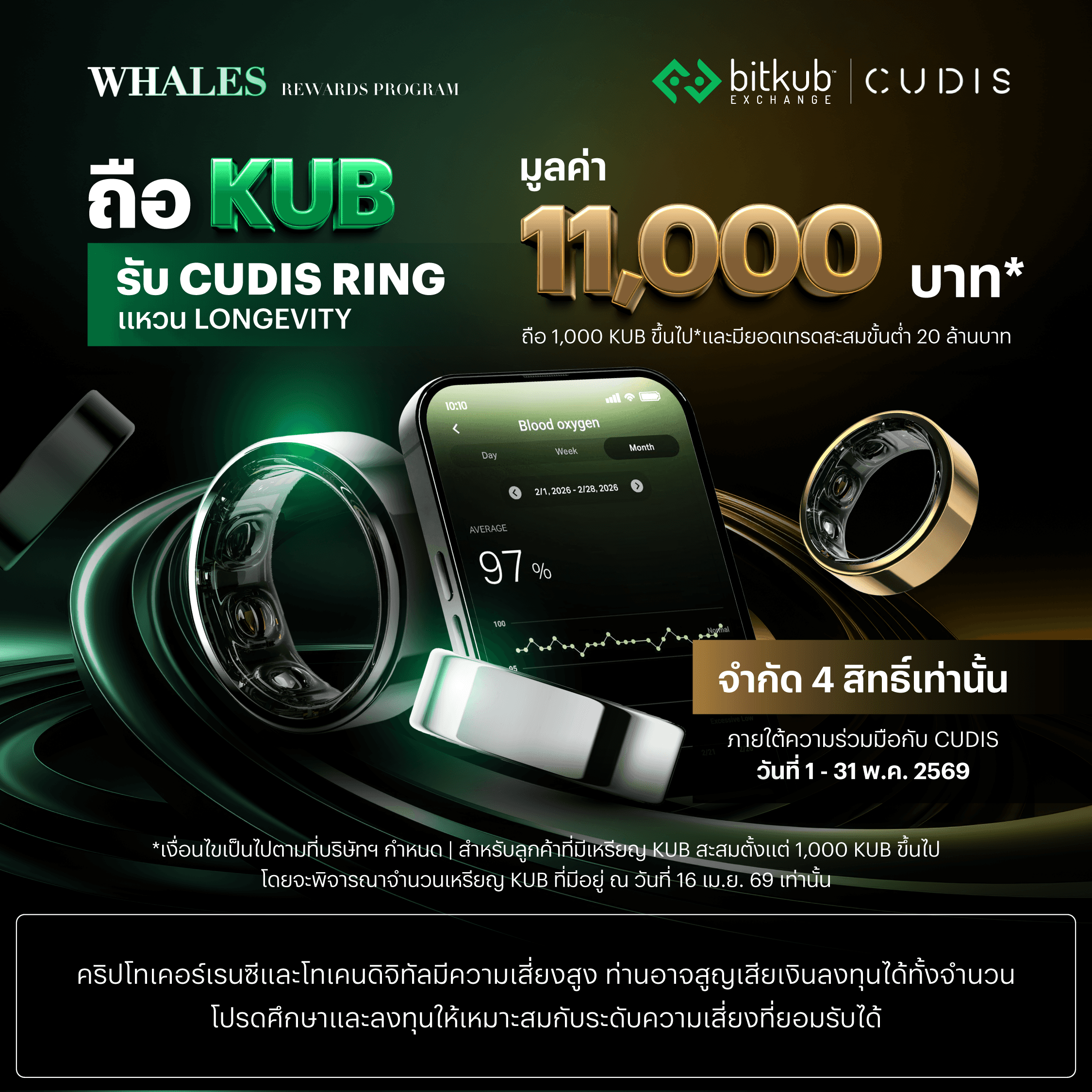 2. ถือ KUB รับแหวน CUDIS เฉพาะผู้ที่มีเหรียญ KUB สะสมตั้งแต่ 1,000 KUB ขึ้นไป โดยจะพิจารณาจำนวนเหรียญ KUB ที่มีอยู่ ณ วันที่ 16 เม.ย. 69 เท่านั้น และต้องมีการเทรดเหรียญใดก็ได้ ขั้นต่ำ 20,000,000 บาท วันที่ 1 - 31 พ.ค. 69 จะมีสิทธิ์เข้าร่วมเพื่อรับรางวัล รับแหวน CUDIS มูลค่า 11,000 บาท จำกัด 4 สิทธิ์
