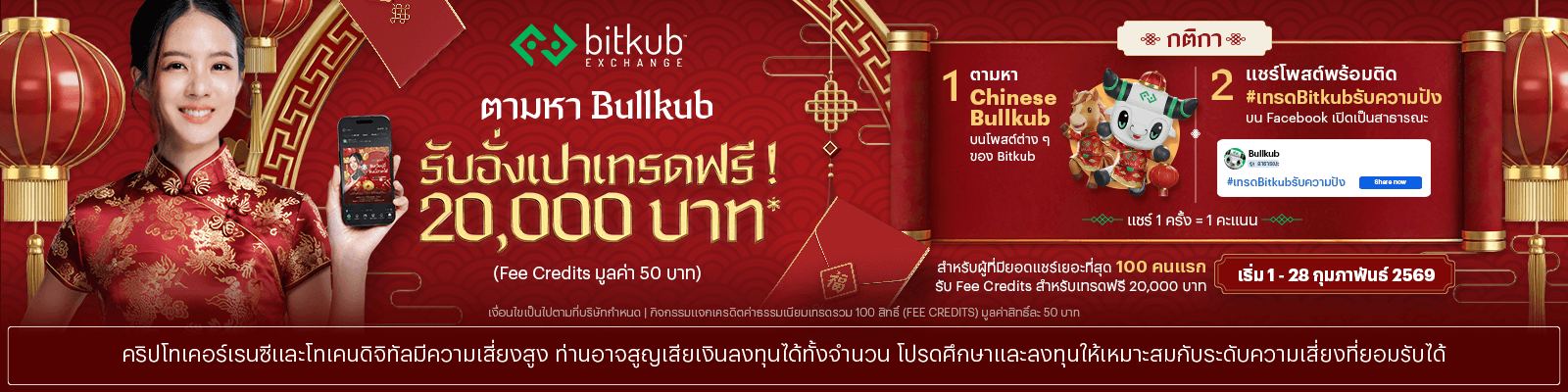 5. บริษัทจะจัดส่งเครดิตค่าธรรมเนียมการเทรดมูลค่า 50 บาท ให้กับผู้เข้าร่วมกิจกรรมที่แชร์ “Chinese Bullkub จำนวนโพสต์เยอะที่สุด 100 ท่านแรก ภายในวันที่ 1-28 ก.พ. 69