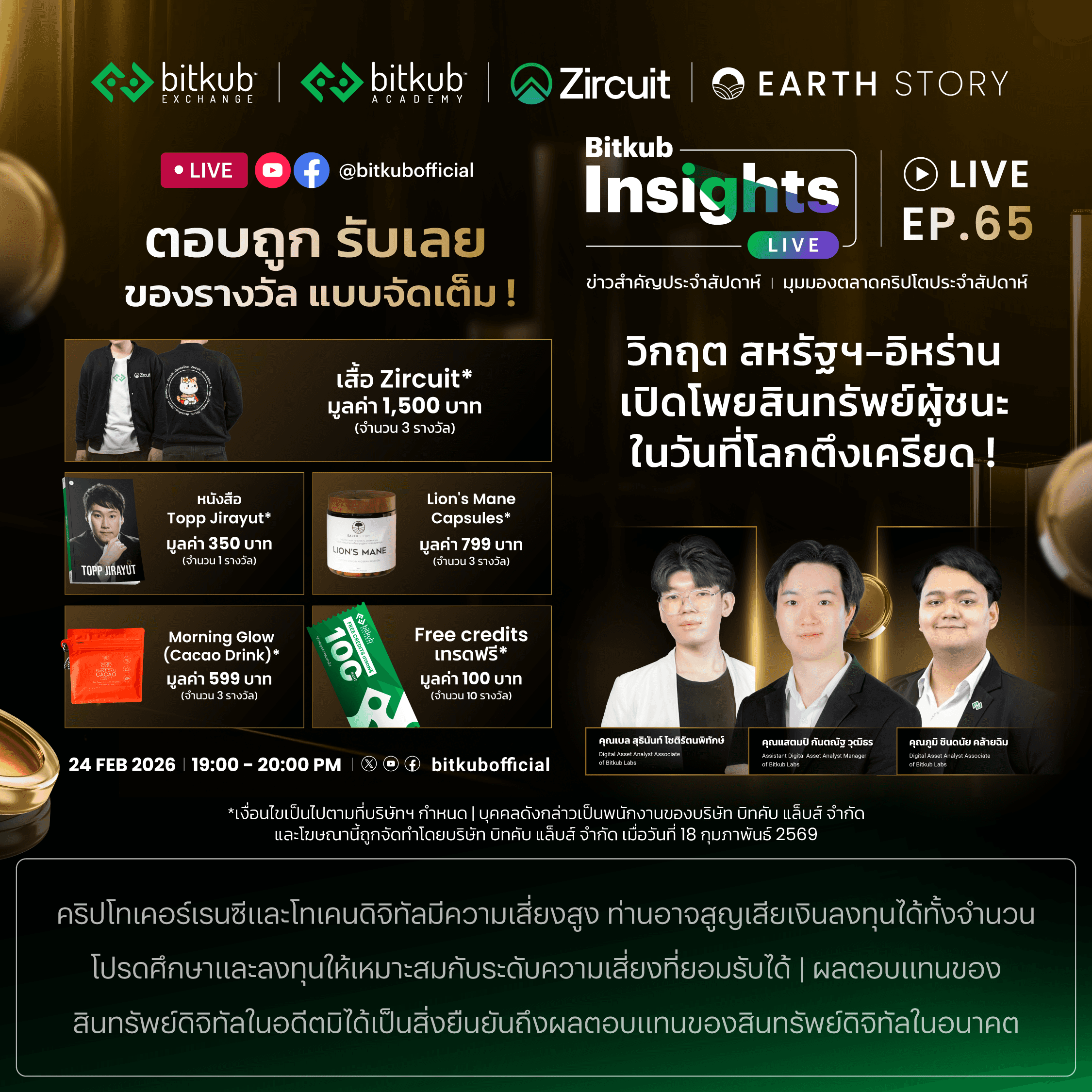 4. ผู้ร่วมกิจกรรมจะต้องตอบคำถามเพื่อรับของรางวัล ผ่านรายการ Bitkub Insights Live วันที่ 24 ก.พ. 69 เวลา 19:00-20:00 น. บนเพจ Facebook : Bitkub