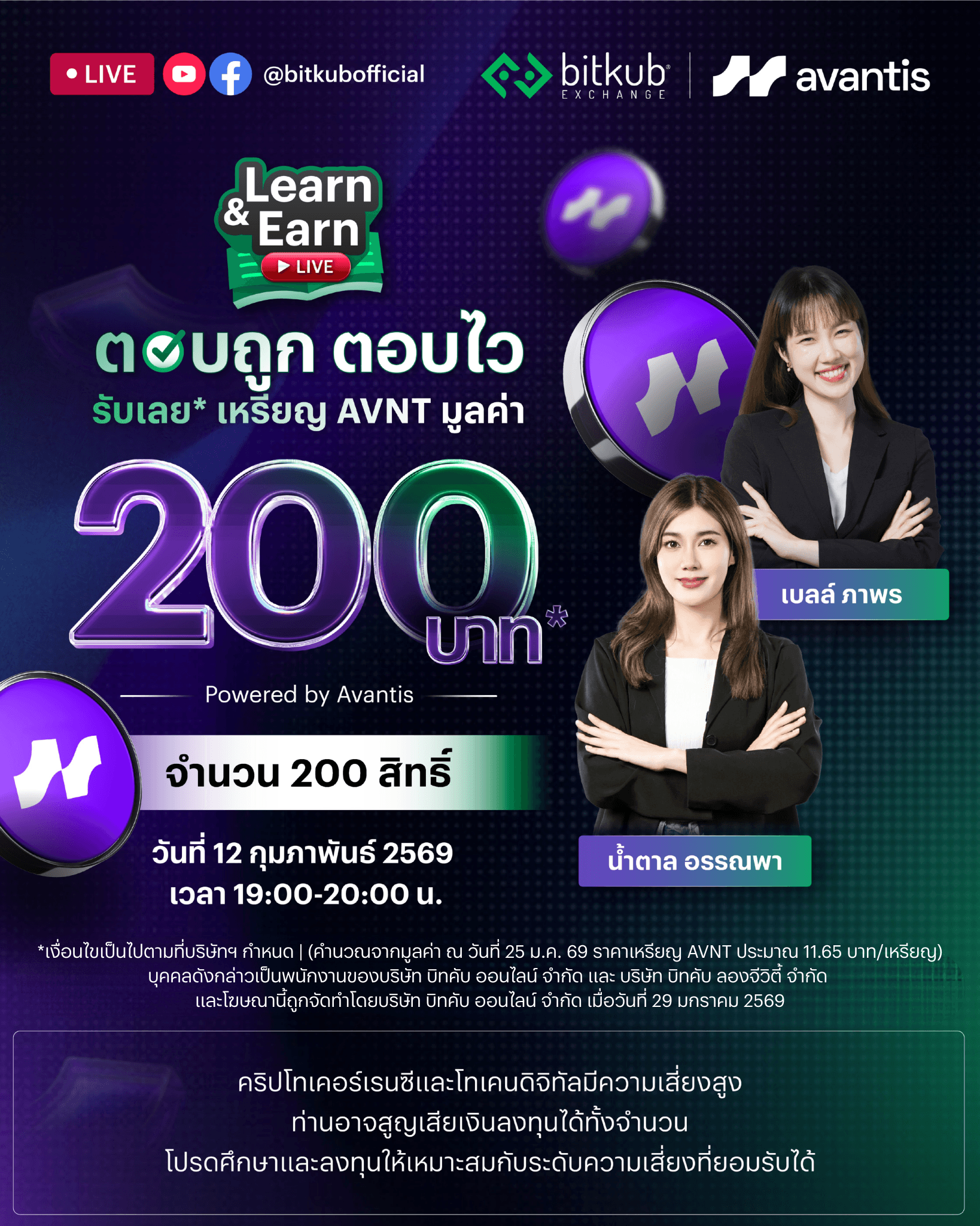 https://form.bitkub.com/learn-and-earn-avnt-feb12 ระหว่างวันที่ 9 - 12 ก.พ. 69