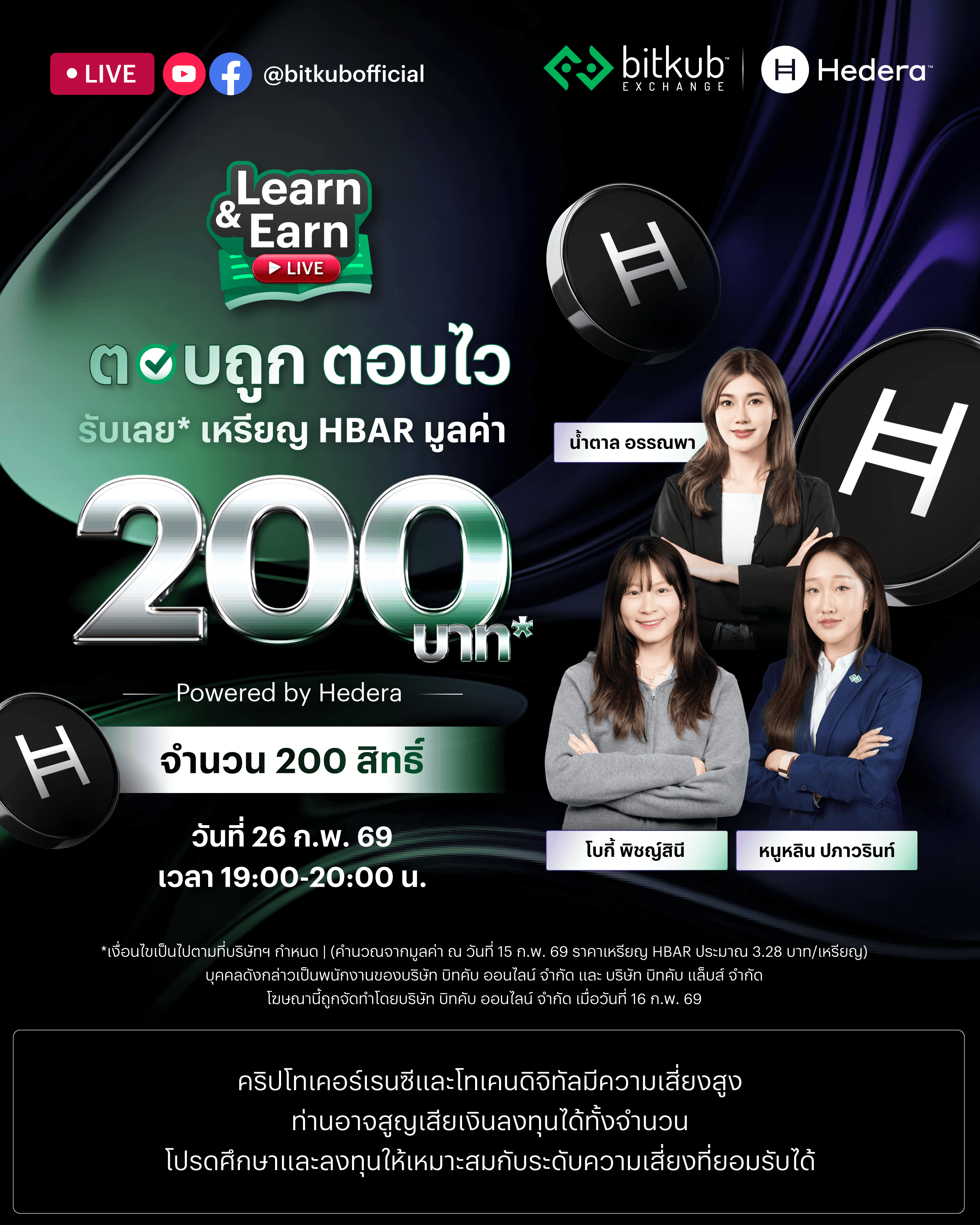 4. ผู้ร่วมกิจกรรมจะต้องตอบคำถามเพื่อรับของรางวัล ผ่านรายการ Learn and Earn LIVE วันที่ 26 ก.พ. 69 เวลา 19:00-20:00 น. บนเพจ Facebook : Bitkub